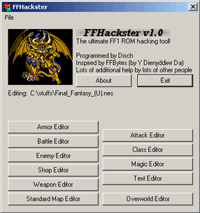 FFHackster is a tool for editing the Final Fantasy 1 ROM. It allows you to change various text in the game,